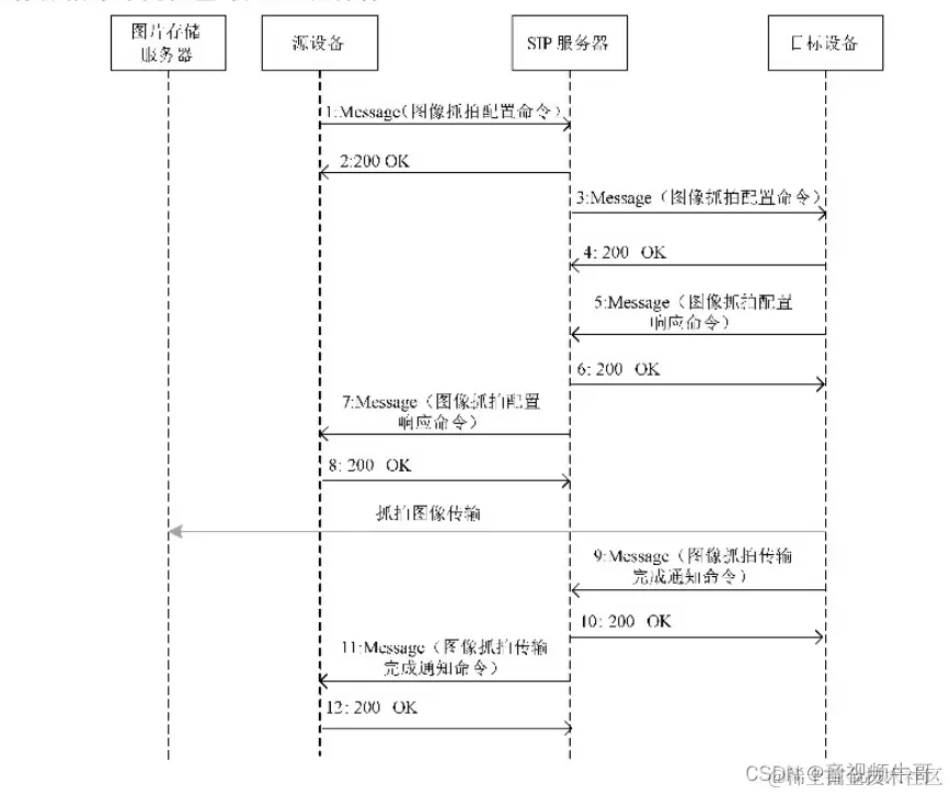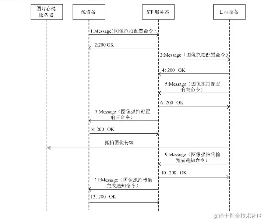 - 目标设备完成图像传输后,发送图像抓拍传输完成通知命令,采用IETF RFC3428中的MESSAGE方法实现。