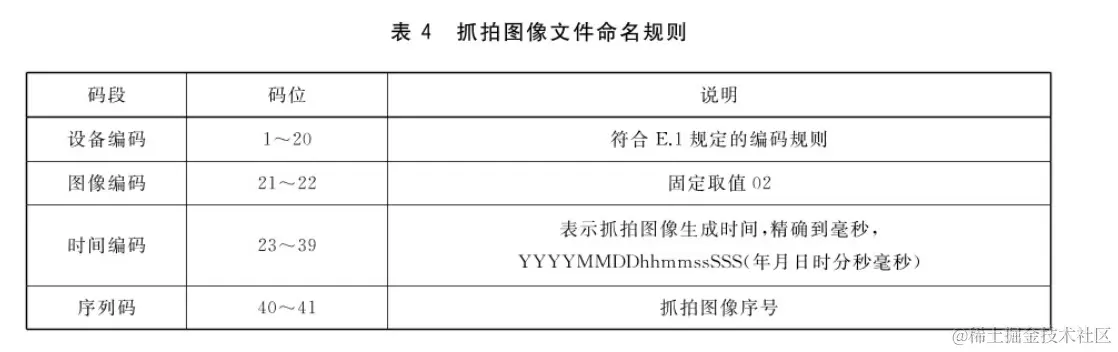 - 图像文件命名规则宜采用“设备编码(20位)、图像编码(2位)、时间编码(17位)、序列码(2位)”的形式
