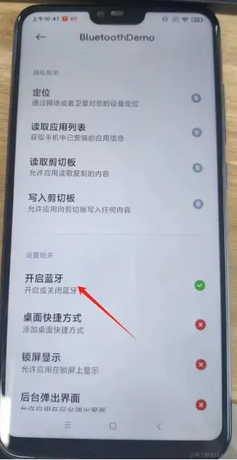 - 2、用户还要点击设置->应用设置->应用管理->找到项目(BluetoothDemo)->点击权限管理->开启蓝牙。