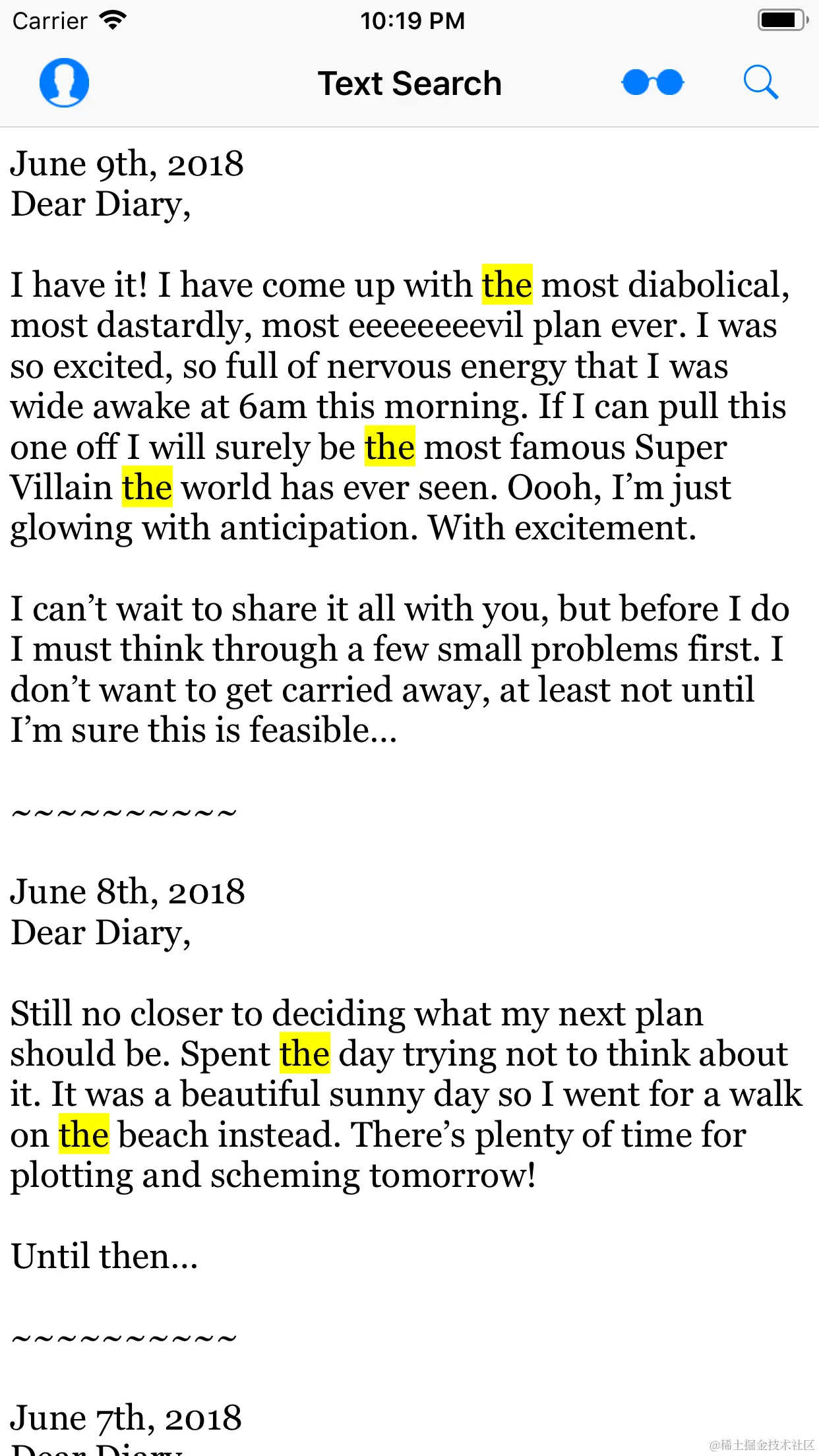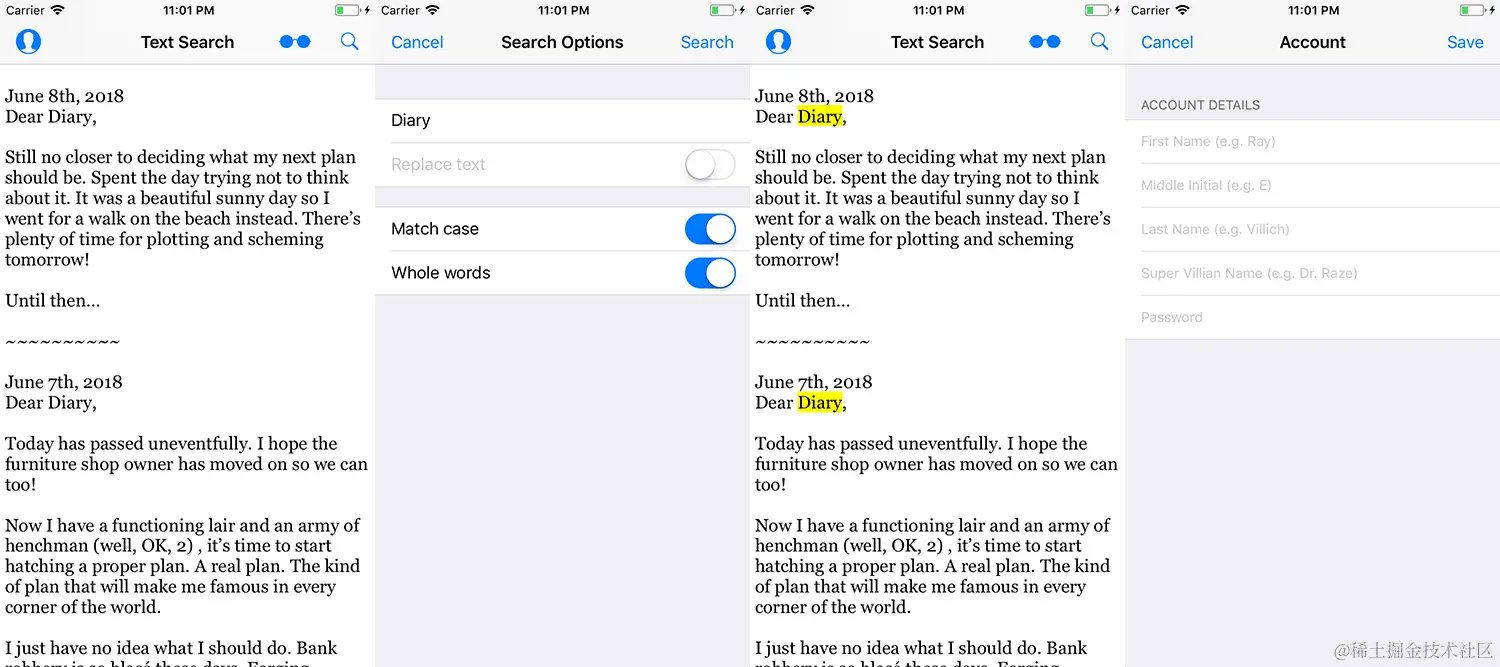 SearchViewController有一个只读的UITextView视图,其中包含老板私人日记的摘录。 - 导航栏包含一个搜索按钮,该按钮将以模态方式呈现
