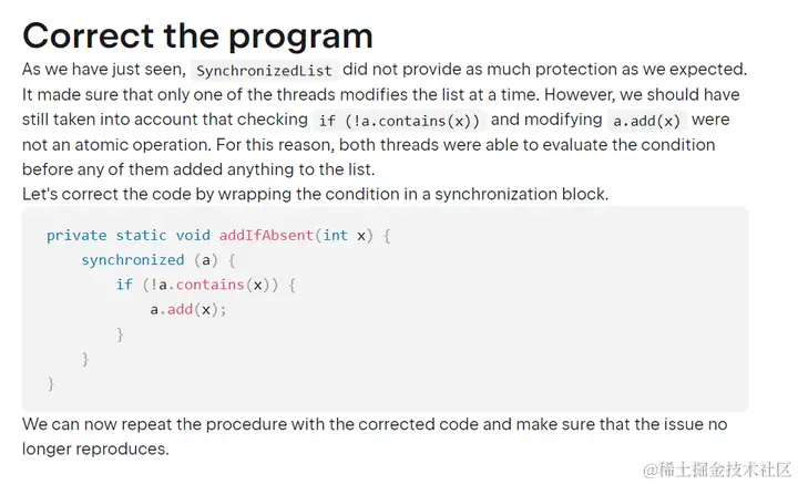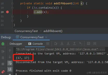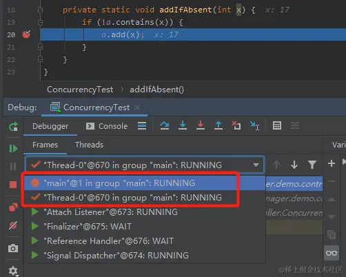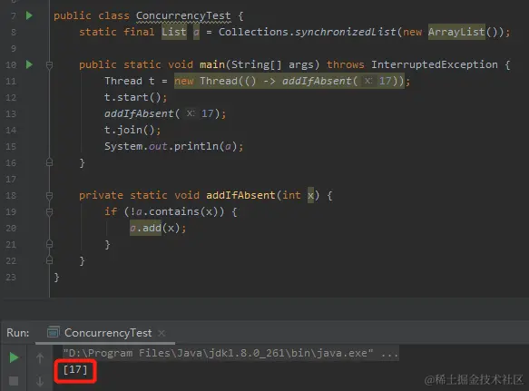 Thread t = new Thread(() -> addIfAbsent(17));
