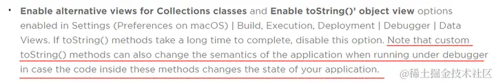 翻译过来就是:老铁请注意,如果 toString 方法中的代码更改了程序的状态,则在 debug 状态下运行时,这些方法也可以更改应用程序的运行结果。
