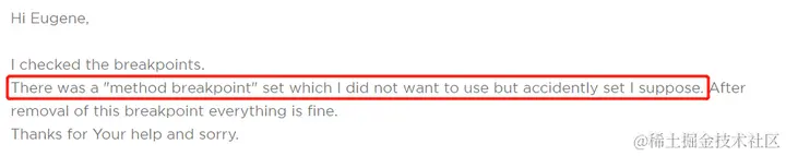 确实是有个方法断点,他也不知道怎么打上这个断点的,可能和我一样,是手抖了吧。