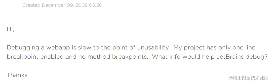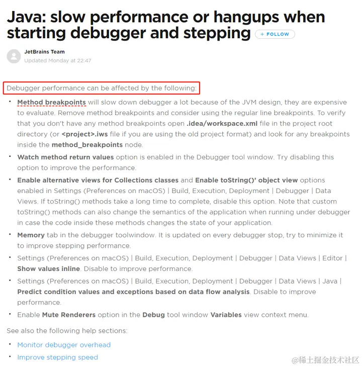 这个贴子,是 JetBrains Team 发布的,关于 Debug 功能可能会导致的性能缓慢的问题。