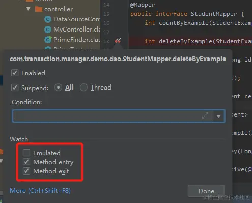 当我把方法断点加在 Mapper 的接口里面的时候,能稳定复现这个问题: