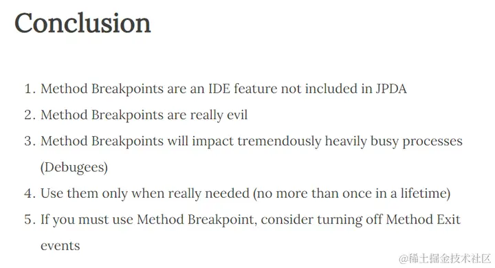 他们说由于 JVM 的设计,方法断点会大大降低调试器的速度,因为这玩意的 “evaluate” 成本很高。
