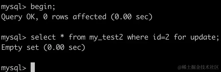 事务A执行:SELECT * FROM my_test2 WHERE id=2 for UPDATE; 会锁住(0,5)这个间隙。