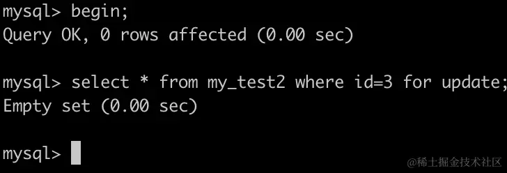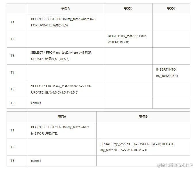 事务B执行SELECT * FROM my_test2 WHERE id=3 for UPDATE;,同样也会锁住(0,5)这个间隙,而且可以成功。