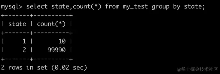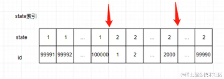 表中一共有10万条数据,只有后10条的state=1(id>99990)