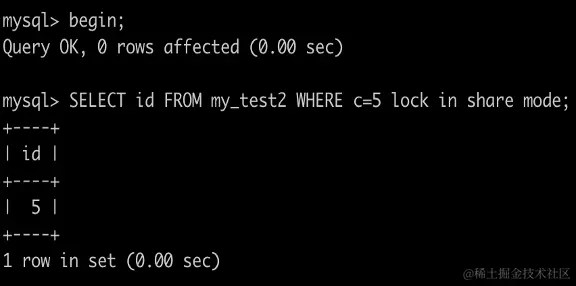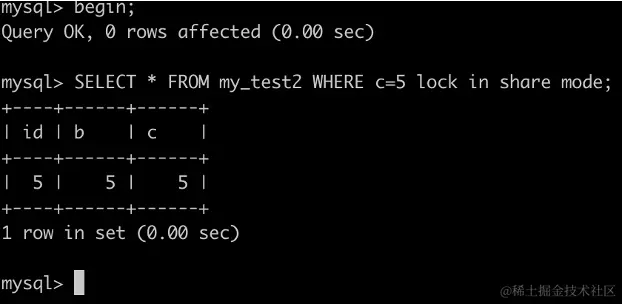 事务A执行SELECT id FROM my_test2 WHERE c=5 lock in share mode``;