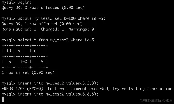 INSERT INTO my_test2 VALUES(21,0,5); //不阻塞