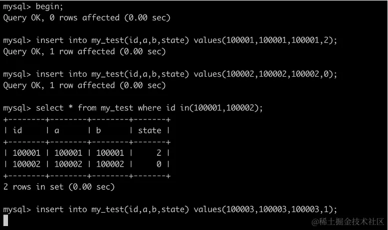 INSERT INTO my_test2 VALUES(1,0,0); //阻塞