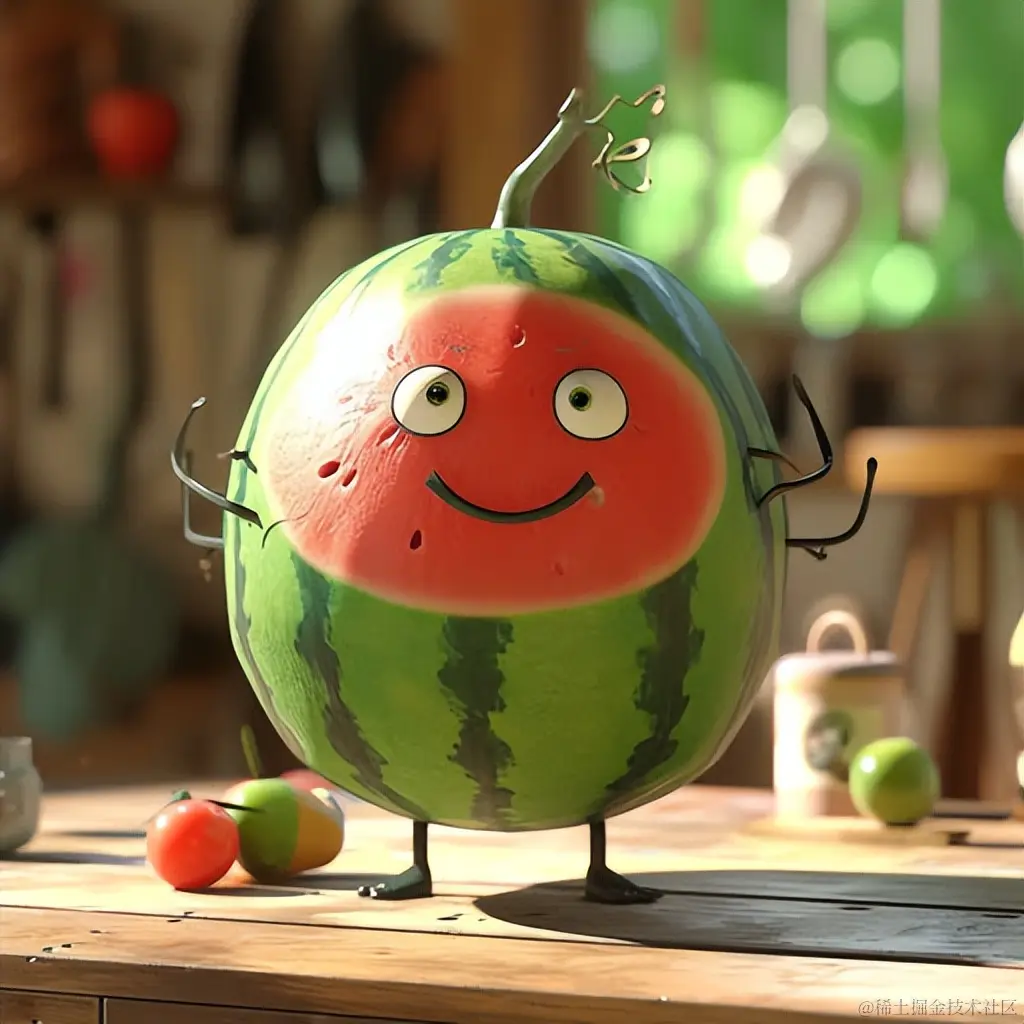 西瓜角色站在桌子上,迪士尼动画风格,照片逼真,超逼真的细节,Smilecore,UE5,Heatwave,卡通面孔