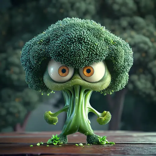 绿色西兰花角色,大而可怕的眼睛,Mike Campau风格,动画插图,Victor Nizovtsev风格