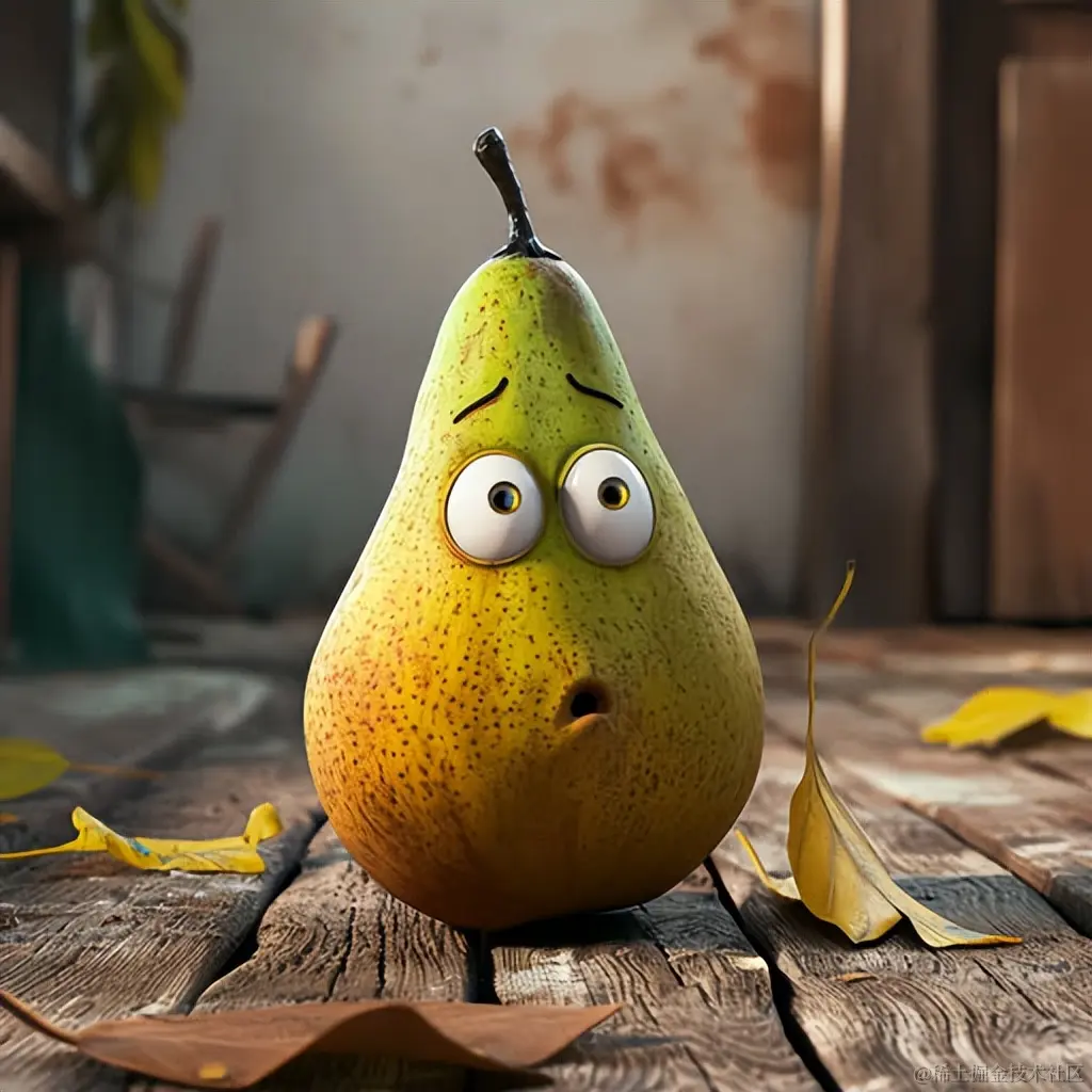 动画梨带着眼睛和表情,Raphael Lacoste、Thomas Kinkade、Peter Sculthorpe风格,照片逼真,官方艺术,玩味角色设计,Fujifilm GW690III