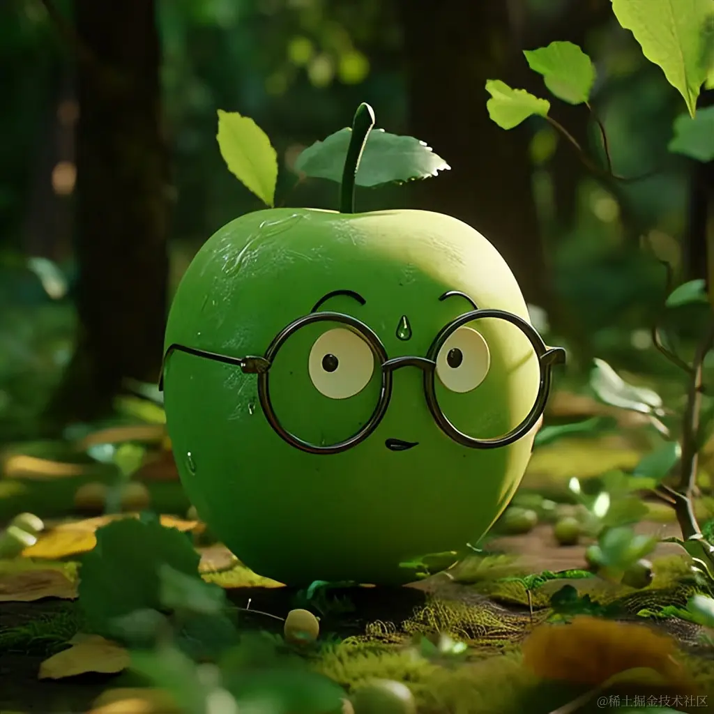 在森林中佩戴眼镜的可爱绿色3D苹果,动画电影先锋风格,精心布置的水果,逼真的雕塑,硬表面建模,McDonaldpunk,Quito School,Les Automatistes