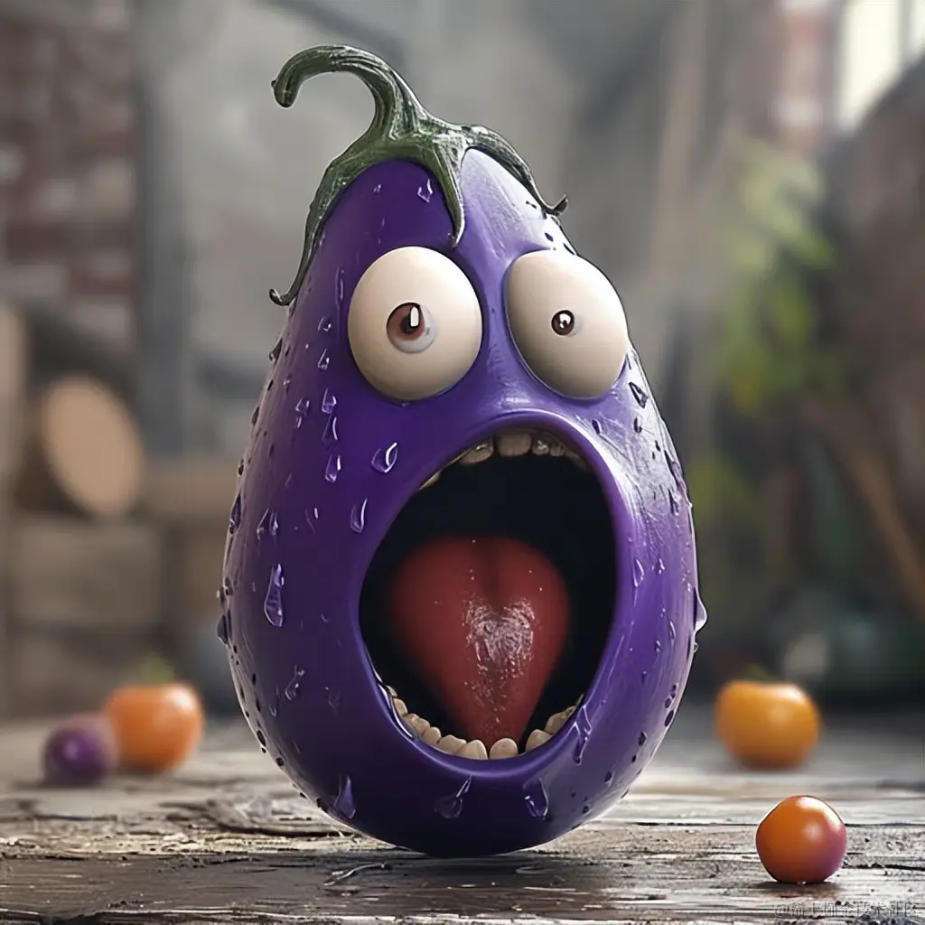 “3D紫色茄子”。在这个幽默而诙谐的世界里,蔬果们以夸张的表情和开放的嘴巴展现出了独特的艺术风格。