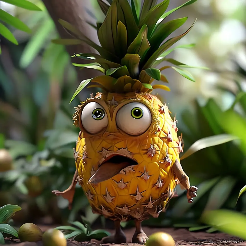 热带菠萝的小卡通模型,睁大眼睛,Unreal Engine 5、Hans Zatzka、玩味卡通,Atey Ghailan、电影截图,Ferrania P30、高质量照片