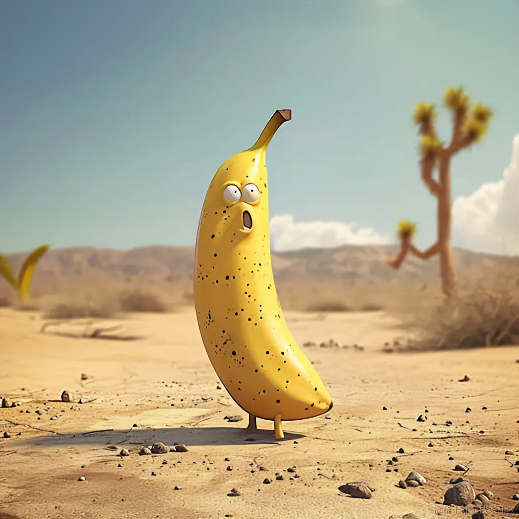 黄色香蕉卡通站在沙漠中,Bill Gekas、动画表情、Cranberrycore、Tim Shumate风格,潮湿,超逼真的动物插图,Bombacore