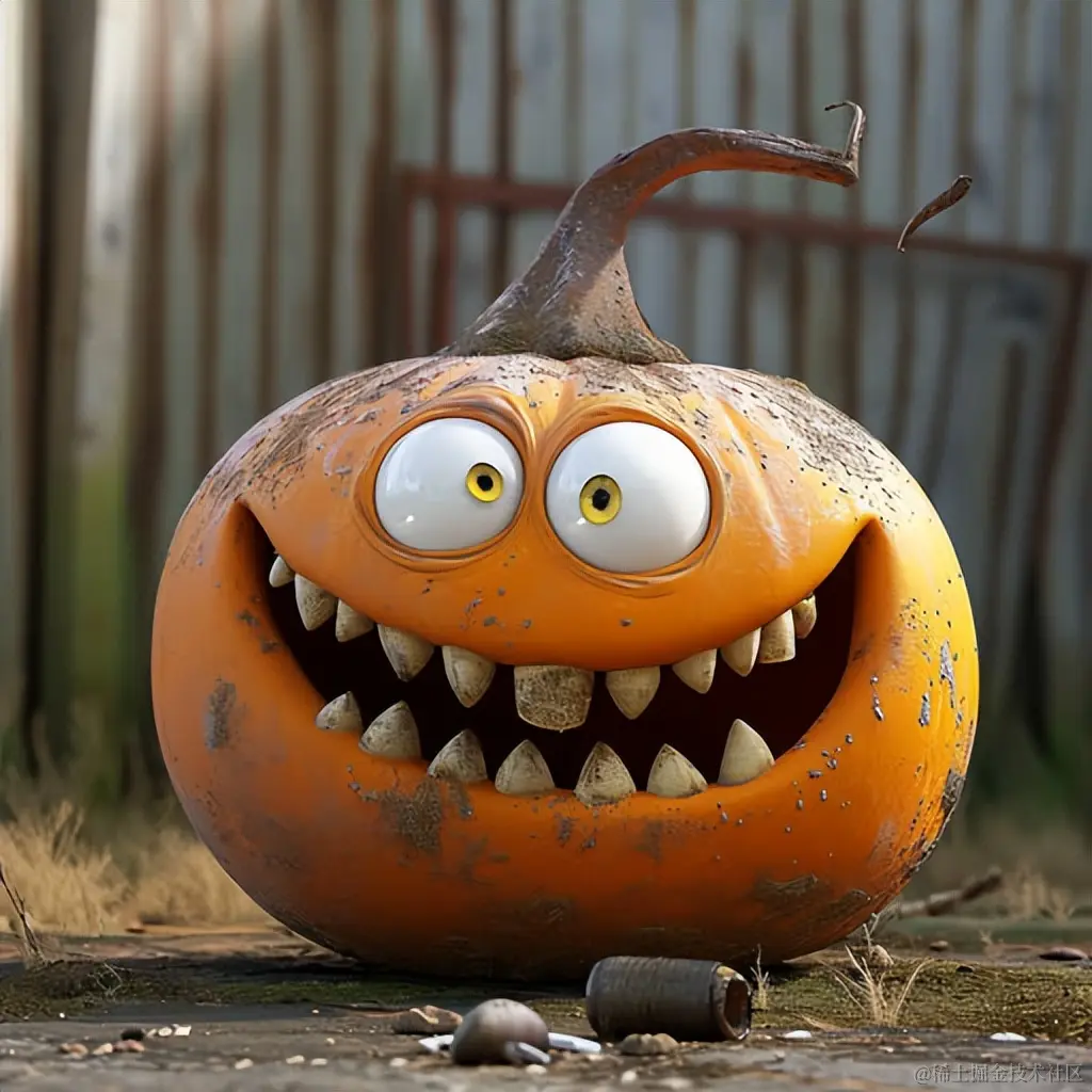 3D可爱南瓜,有眼睛和牙齿,Tiago Hoisel、Goro Fujita、Todd Nauck风格,俏皮、异想天开的插画,动画GIF,生锈的残骸,照片逼真的拼贴