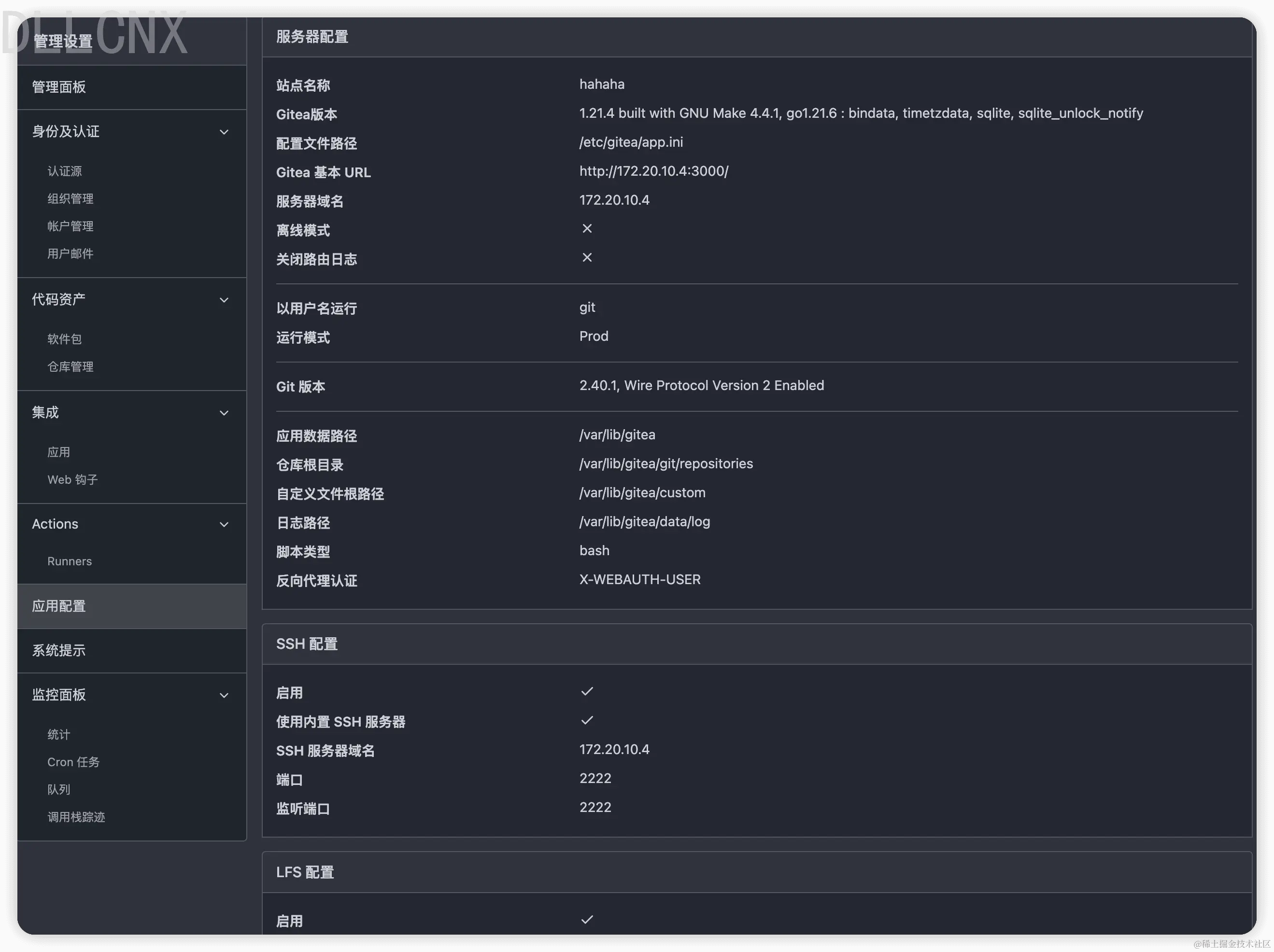这里,我们可以做整个系统的管理,包括用户管理,仓库管理,监控等等。如果我们一些配置无法通过管理中心修改,需要去更改配置文件。就是我们一开始创建的config文件夹,它下面会自动创建一个app.ini文件。以下只是本次默认的一些配置,我们可以查看官方文档针对自己再进行更适合自己的优化与配置。之前我们没配置或者配置错的所有配置其实都可以在这个配置文件里面更改,改完记得重启容器让其生效即可。