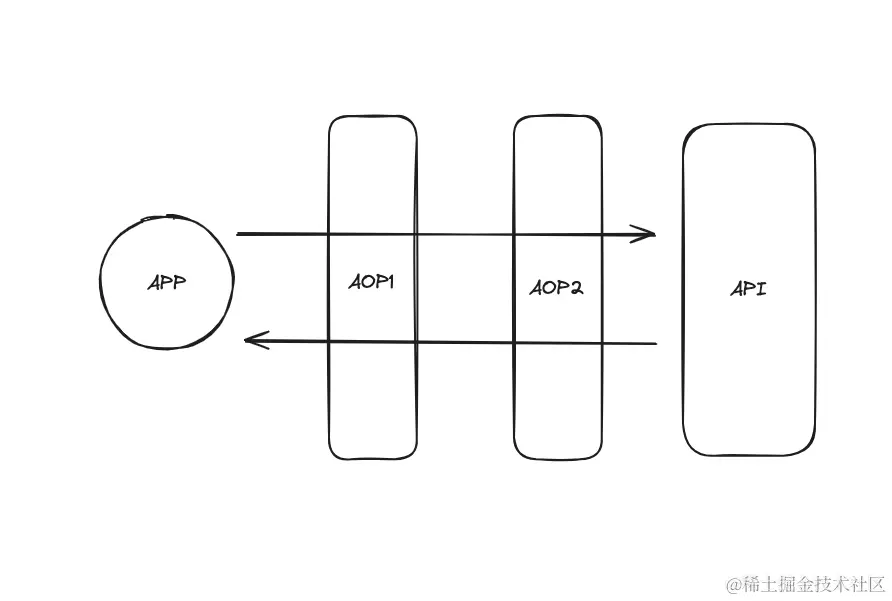 请求:请求先进入到 AOP1,再进入到 AOP2,最后到达 API。