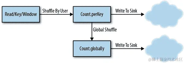 图 5-1 显示了 Dataflow 为示例 5-1 中的管道创建的洗牌。³Count.perKey将每个用户的所有数据洗牌到给定的工作器,而Count.globally将所有这些部分计数洗牌到一个单一的工作器以计算全局总和。