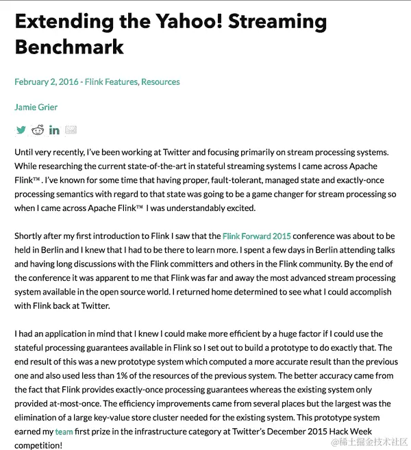 当时,Flink 具有提供精确一次语义以及本地支持事件时间处理的能力是一个巨大的进步。但直到 Jamie Grier 发表了题为“扩展 Yahoo!流式基准”(图 10-30)的文章,才清楚地表明了 Flink 的性能。在那篇文章中,Jamie 描述了两个令人印象深刻的成就: