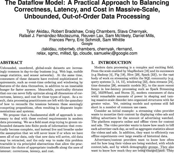 该模型最初出现在 Flume 中,当时我们试图将 MillWheel 中强大的无序处理支持纳入 Flume 提供的更高级别的编程模型中。随后,Flume 在谷歌内部可用的综合批处理和流处理方法成为 Dataflow 中包含的完全统一模型的基础。