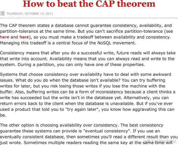 ⁷ 顺便说一句,我还强烈推荐阅读 Martin Kleppmann 的《CAP 定理批评》(bit.ly/2ybJlnt),对 CAP 定理本身的缺点进行了很好的分析,以及更有原则的替代方法来看待同样的问题。