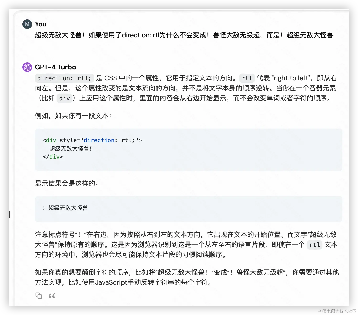 第一时间上MDN查这玩意:direction - CSS:层叠样式表 | MDN,没找到太多有用的信息,但是猜也猜到是文字序变了,相当于“超级无敌大怪兽!”变成了“!兽怪大敌无级超”。但是很神奇,实际的效果是只有感叹号变到前边去了,文字并没有倒序,于是问了问聪明的ChatGPT: