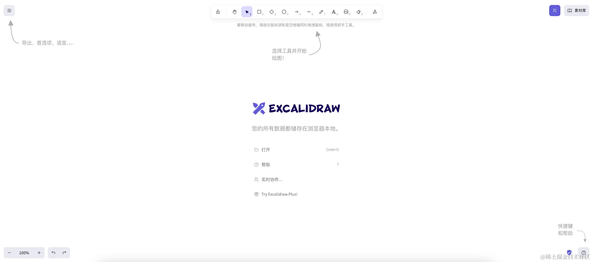 另外为了让用户更容易的接触和上手,Excalidraw还提供了在线的环境,excalidraw.com/