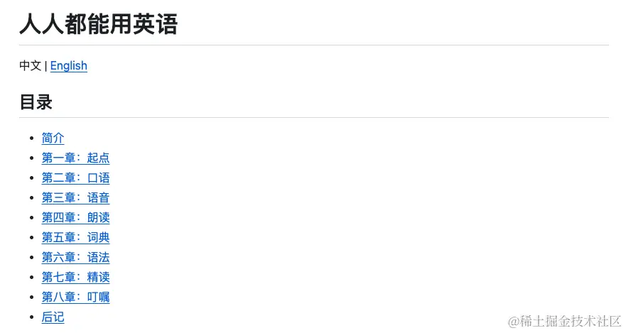 人人都能用英语,这是李笑来老师写的一本书,介绍了普通人如何学习英语,一共八章,Github 就可以直接阅读。英语真的很重要,不管是学习编程还是了解一些新消息,英语都很有帮助。