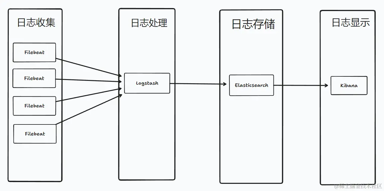 ELK的架构有多种,本篇分享使用的架构如图所示: Beats(Filebeat) -> -> Elasticsearch -> Kibana,目前生产环境一天几千万的日志,内存占用大概 10G 左右
