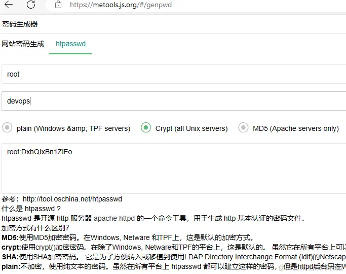 添加对应的passwd文件,使用 htpasswd 生成,如账号密码是 root devops666 的配置文件