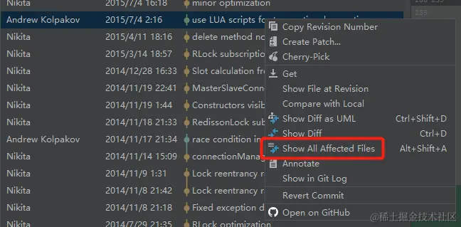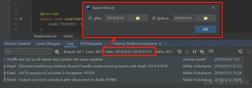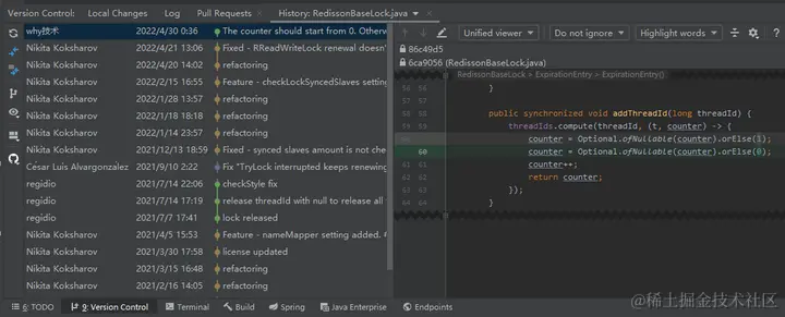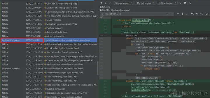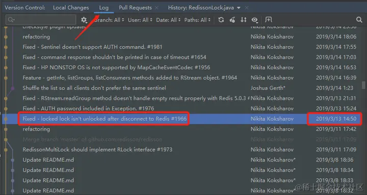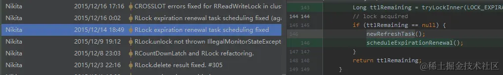 那我就在 RedissonLock.java 的历史提交记录里面用找一下 renewExpiration 这个方法什么时候是第一次提交的就行了。
