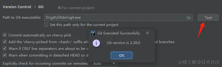 设置完成之后,可以点击旁边的 test 按钮,如果有弹窗告诉你对应的版本号,那就说明配置成功了: