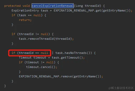 首先第一次提交,加入了 else 分支,里面执行了一次 cancelExpirationRenewal 方法,入参是 threadId。