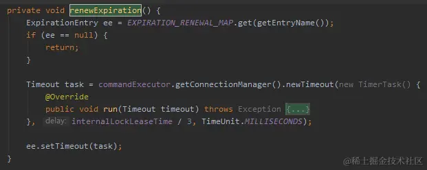 首先我知道启动看门狗的代码是位于 RedissonLock.java 中的 renewExpiration 这个方法: