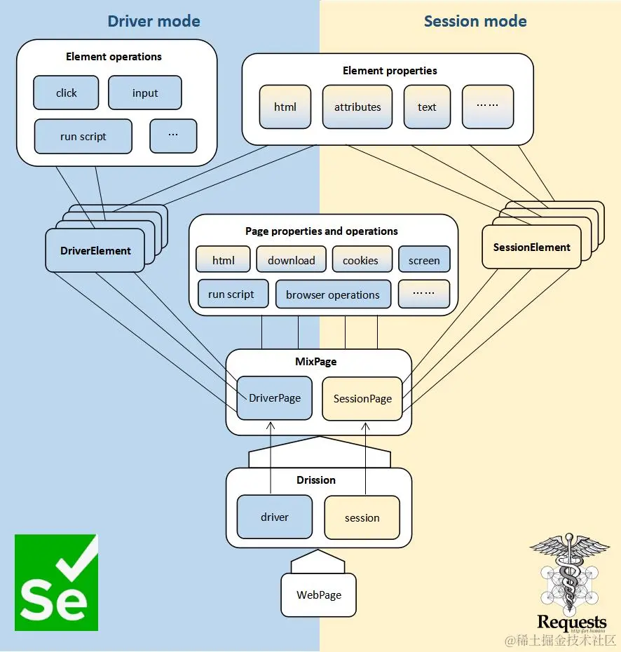 因此,这个库将 selenium 和 requests 合二为一,不同需要时切换相应模式,并提供一种人性化的使用方法,提高开发和运行效率。除了合并两者,本库还以网页为单位封装了常用功能,简化了 selenium 的操作和语句,在用于网页自动化操作时,减少考虑细节,专注功能实现,使用更方便。