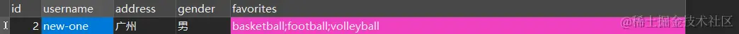 首先建立了一个t_user表存储用户信息,这个表中有一栏favorites是记录个人爱好的,爱好包括篮球、足球、排球: