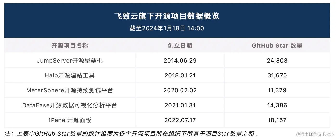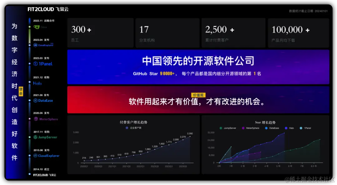 飞致云的开源之旅起步于2017年11月对JumpServer开源堡垒机项目(github.com/jumpserver )的收购。此后基于长期的开源企业战略和持续完善的社区生态,飞致云相继创立MeterSphere开源持续测试平台项目(github.com/metersphere )、DataEase开源数据可视化分析平台项目(github.com/dataease )和1Panel开源面板项目(github.com/1Panel-dev ),并且于2021年1月收购Halo开源建站工具项目(github.com/halo-dev )。