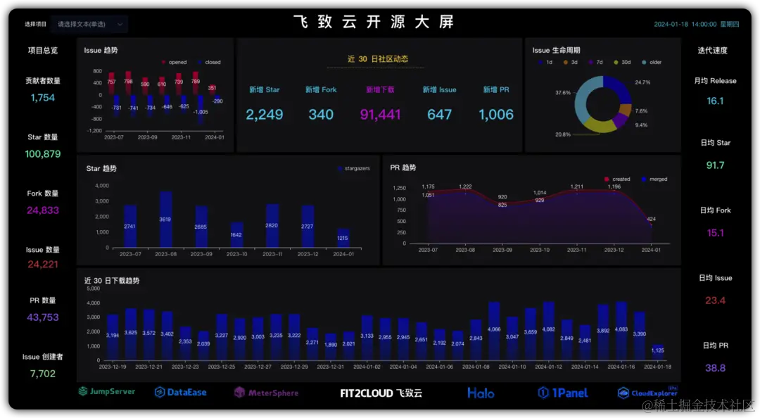 2024年1月19日,中国领先的开源软件提供商FIT2CLOUD飞致云宣布,其旗下开源项目在代码托管平台GitHub上所获得的Star数量已经超过100,000个。 与此同时,飞致云旗下开源项目的月度新增软件下载次数也超过100,000次。