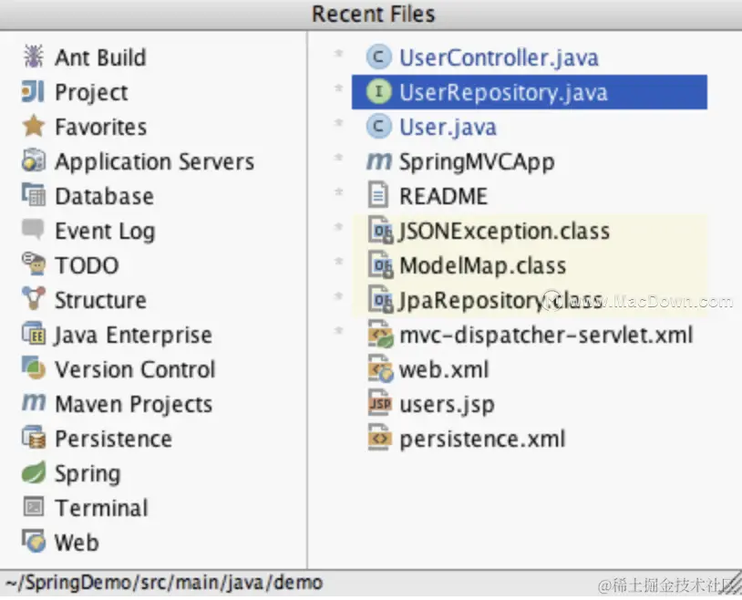 大多数情况下,您使用一组有限的文件,并需要快速切换它们。这里真正节省时间的是一个名为Recent Files的操作,通过按下调用 ⌘E。默认情况下,焦点位于上次访问的文件上。请注意,您还可以通过此操作打开任何工具窗口: