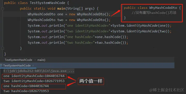 示例一:WhyHashCodeDto没有重写 hashCode()方法,所以 identityHashCode 和 hashCode 的值是一样的: