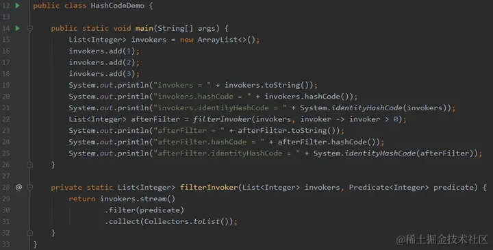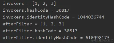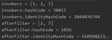 可以看到经过 filterInvoker 方法后,由于集合中所有的元素都满足条件,所以过滤前后,集合中的元素并没有发生变化,导致 hashCode 没有变化。但是由于装元素的容器(集合)已经不是原来的容器了,所以 identityHashCode 发生了变化。