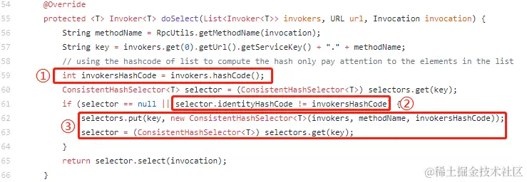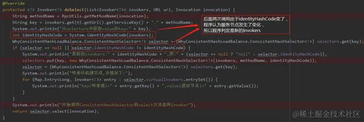 因为在标号为 ① 处得到的 invokersHashCode 和之前的不一样了,所以在标号为 ② 处判断条件为真,进入标号为 ③ 的代码处,重新进行 Hash 环的映射,并选择某个虚拟节点执行该请求。