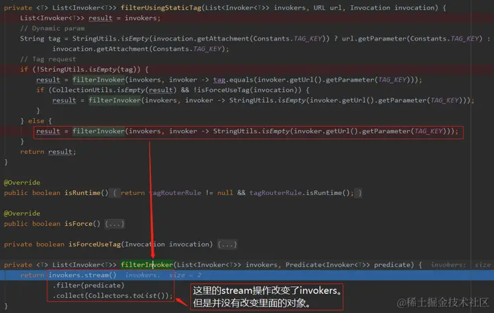 通过源码可以看出:在 TagRouter 中的 stream 操作,改变了 invokers,导致每次调用时其 System.identityHashCode(invokers)返回的值不一样。