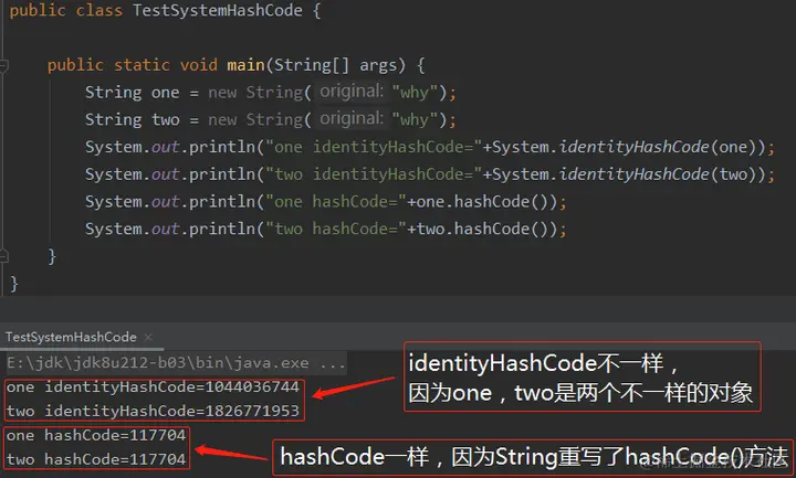 示例二:如下所示,String 是重写了 hashCode()的方法,所以在下面的例子中 identityHashCode 不等于 hashCode: