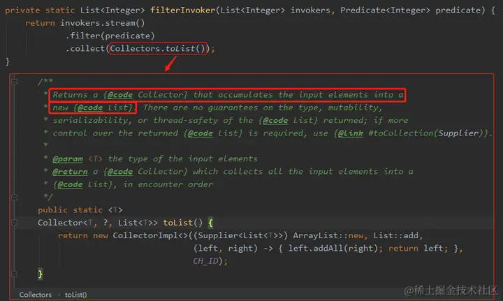 可以看到在源码中,Collectors.toList()方法会 new List。所以都是新的,那么每次的 identityHashCode 必不相同。